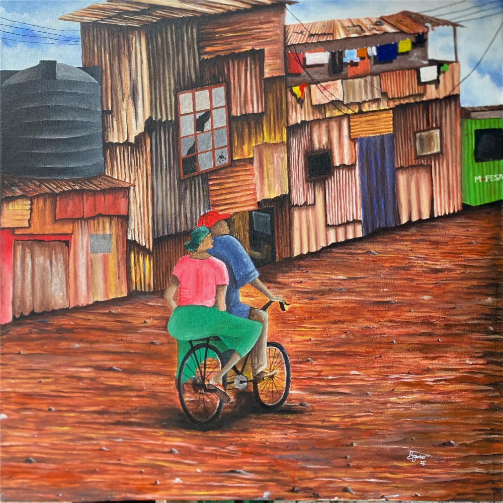 Nairobi’s sharp contrasts — its modern skyline beside vast slums — inspire artists like Brian Gwako to tell the city’s complex story. His work reflects both the energy of progress and the resilience born from struggle, blending bright colors and urban textures to capture life in all its layers.